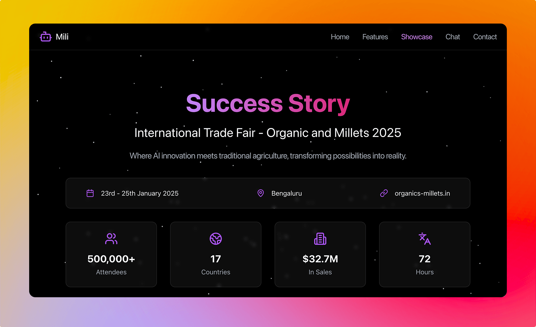 To address these challenges, we developed Milli, an AI-powered chatbot designed as a conversational guide. Accessible through mobile and kiosks, Milli answered frequently asked questions on schedules, logistics, and registration. We also integrated smart navigation tools, including detailed maps of the Palace Grounds with stall and session directories. Recognising the diversity of participants, Milli supported multiple languages ensuring inclusivity for local farmers as well as global visitors. To keep audiences engaged, we added interactive prompts such as "Did you know?" facts about millets, organics, and sustainability. Finally, the solution was built with government-grade security standards, ensuring full compliance with data privacy and IT protocols.